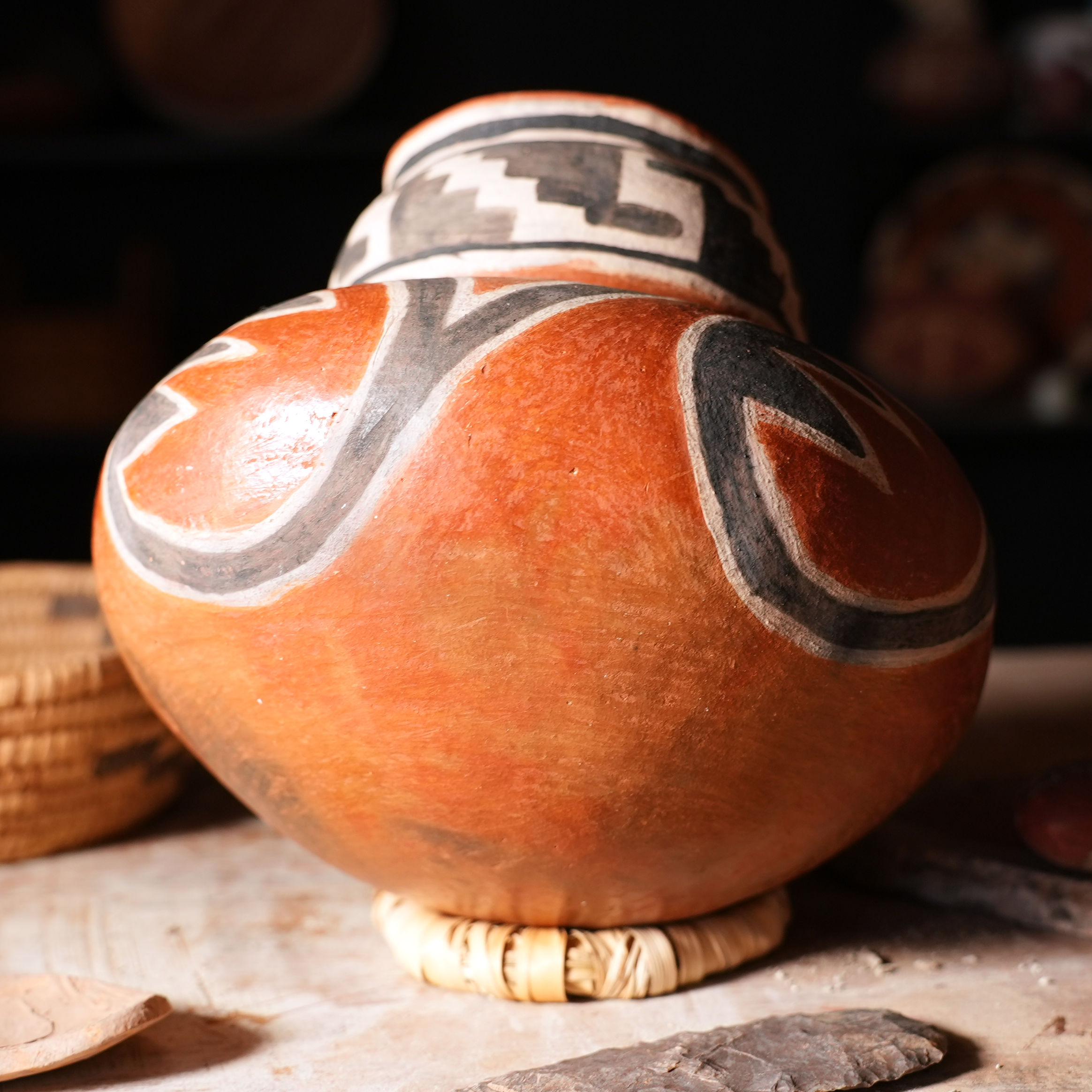This pot was made in the Ancient Potters Club as our November 2023 class project. It was all coil built with wild collected clays, painted with red ochre, white clay and mesquite bean paint. It was fired at a public pottery firing demonstration at Steam Pump Ranch in Oro Valley, Arizona on December 9, 2023.