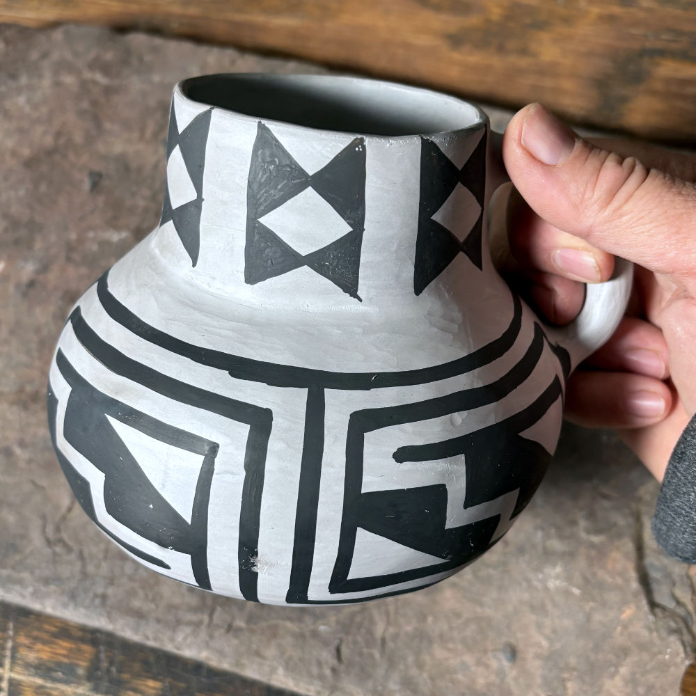 Authentically made Cibola White Ware pitcher. made with wild clay collected near the Mogollon Rim, painted with red hematite paint and fired in a smothered pit fire just like they were made in Arizona centuries ago. Size: 6.5″ x 5.5″