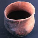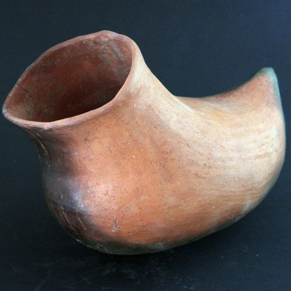 This is an authentic replica of a prehistoric culinary shoe pot which was a common pottery form in ancient times. This pot was hand coiled using native clay from Arizona and fired in an outdoor, open wood fire. 10 1/2″ x 6″ x 7 1/2″