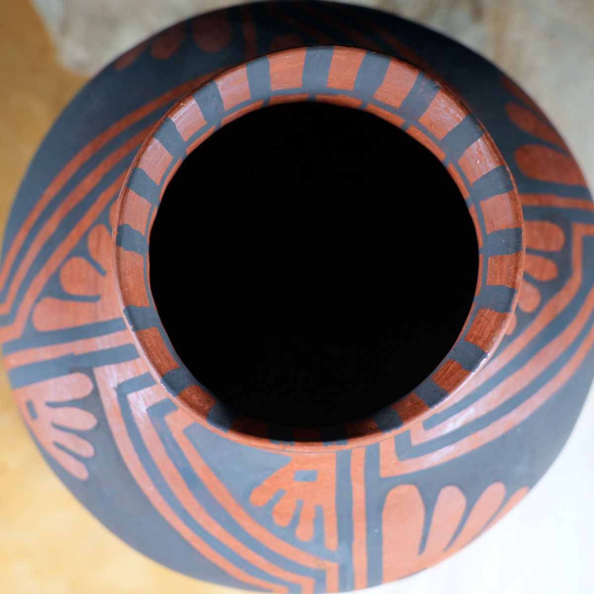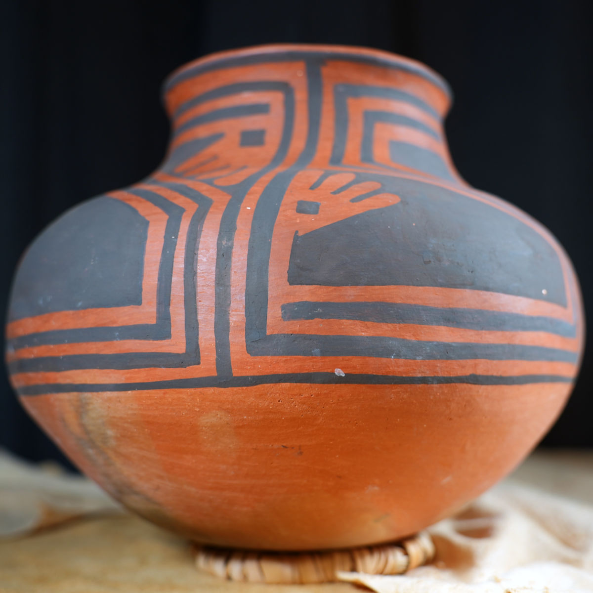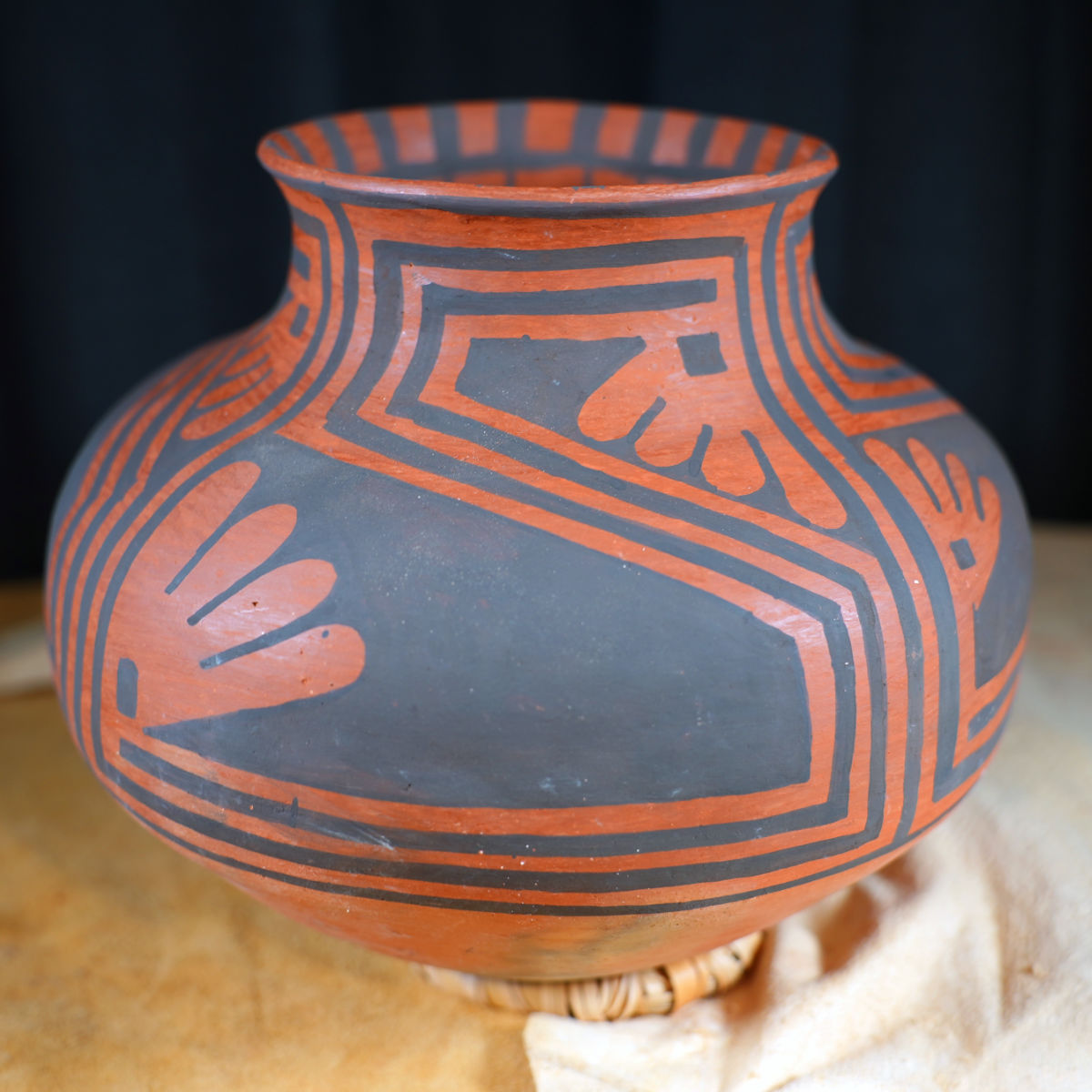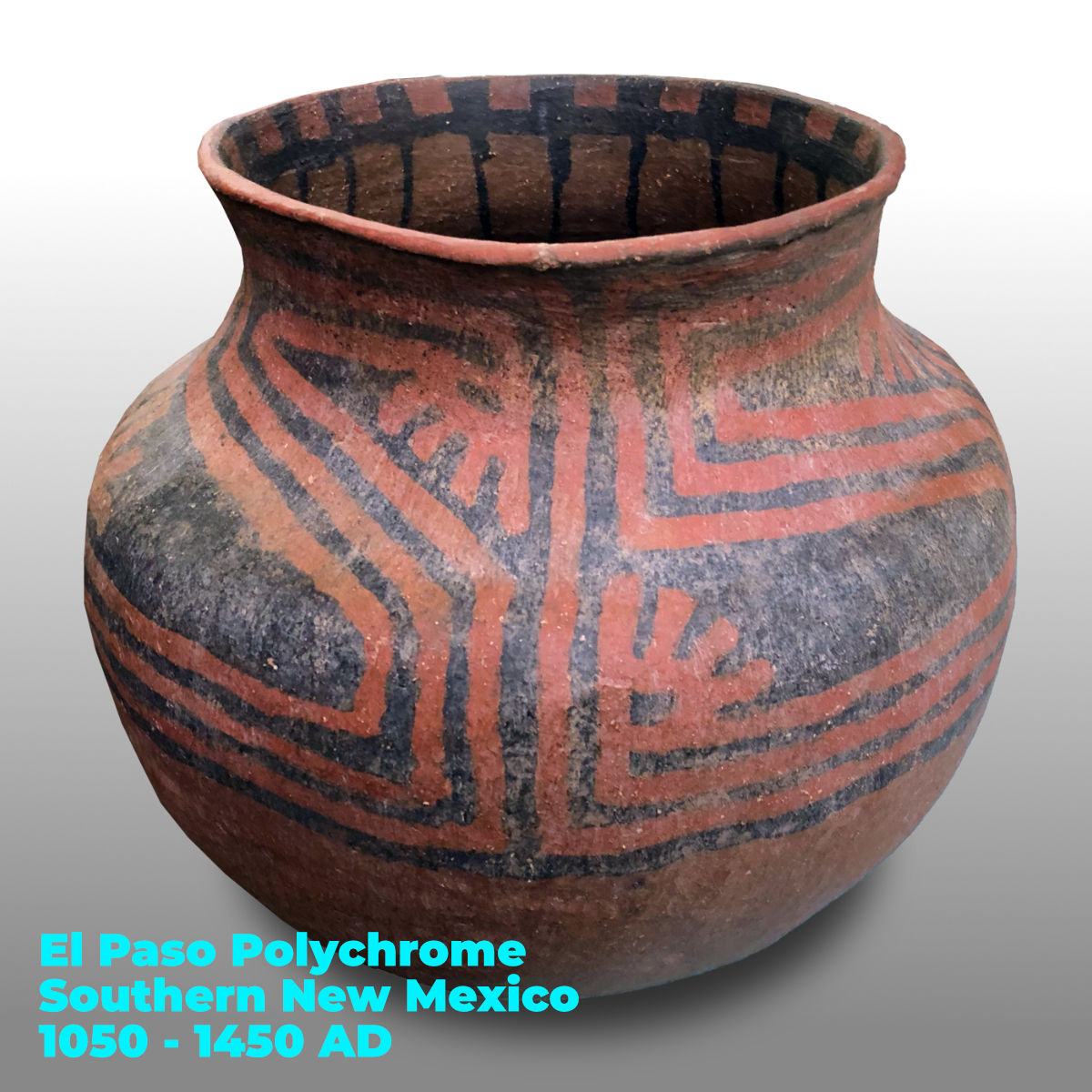This El Paso Polychrome replica olla was made completely authentically with native clays and pigments and fired in an open, mesquite wood fire.