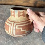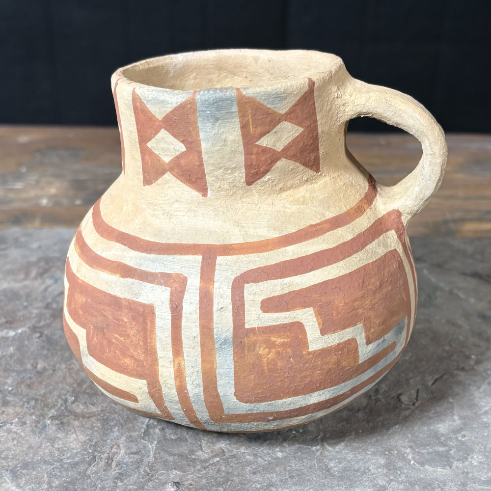 Authentically made red on brown pitcher just like those made and used in southern Arizona over 700 years ago. Made with wild clay from the Gila River Valley, painted with red hematite paint and fired in an outdoor mesquite wood fire. Size: 5.5″ x 5″