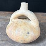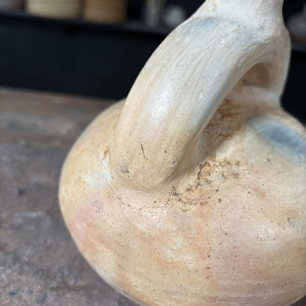 Authentically made stirrup pot, made with wild Arizona clay, coil built and wood fired just like the ancients made them centuries ago. This pot has a small crack near where the neck attaches. Size: 6.5″ x 7″