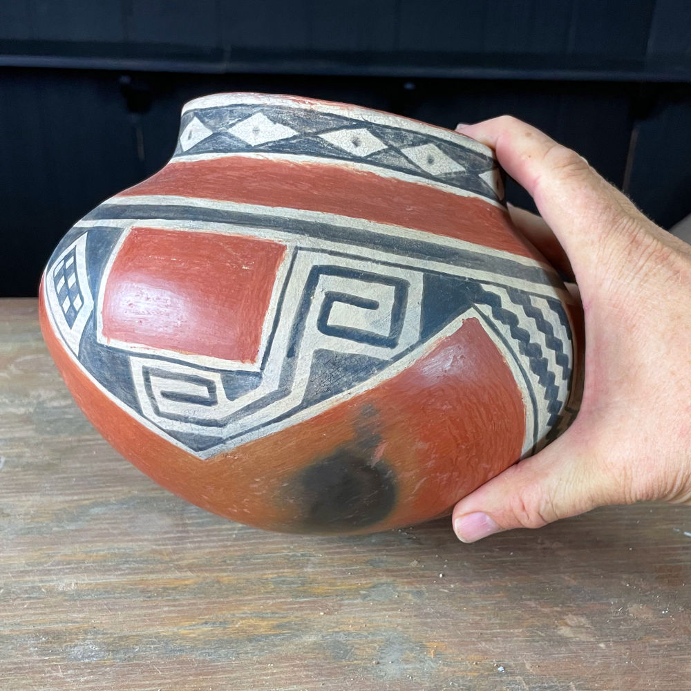 This is a replica of an ancient pot in the Mills Collection at Eastern Arizona College. It is 8.5″ x 6.25″ and was made completely authentically. Hand coiled from native clay, decorated with wild collected slip, mineral and organic paint then fired in an open outdoor fire.