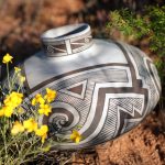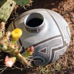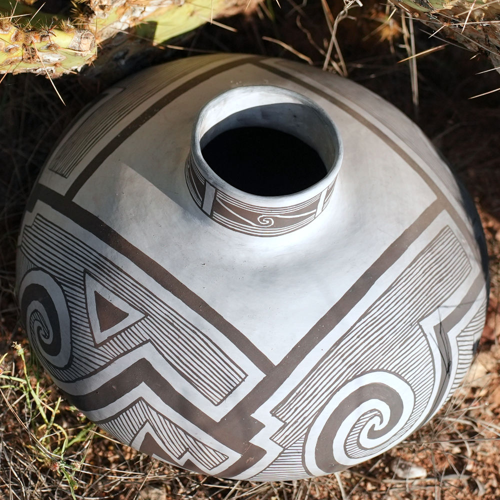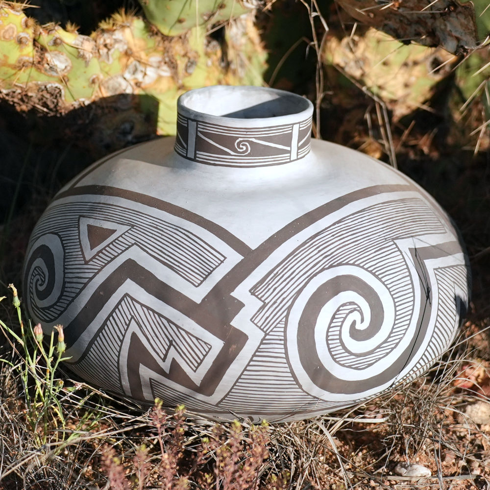 This is a replica of a prehistoric pottery type called “Tularosa Black on White”. 14.5″ x 10″ It was made using hand collected clays and reduced iron mineral paint from Arizona, formed using the traditional coil and scrape method and was fired outside in a traditional smothered pit fire.